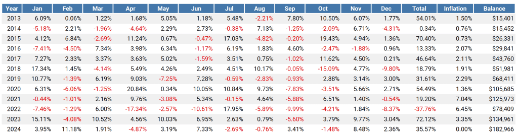 If you had invested $10,000 in 2013 in this portfolio it would now be worth just over $180,000 so an annual return of 27% CAGR and 24% adjusted for inflation. In the best year I was up 72% and in the worse year down 38%, so again reflecting the highs and lows of investing and the value of locking and leaving investments.